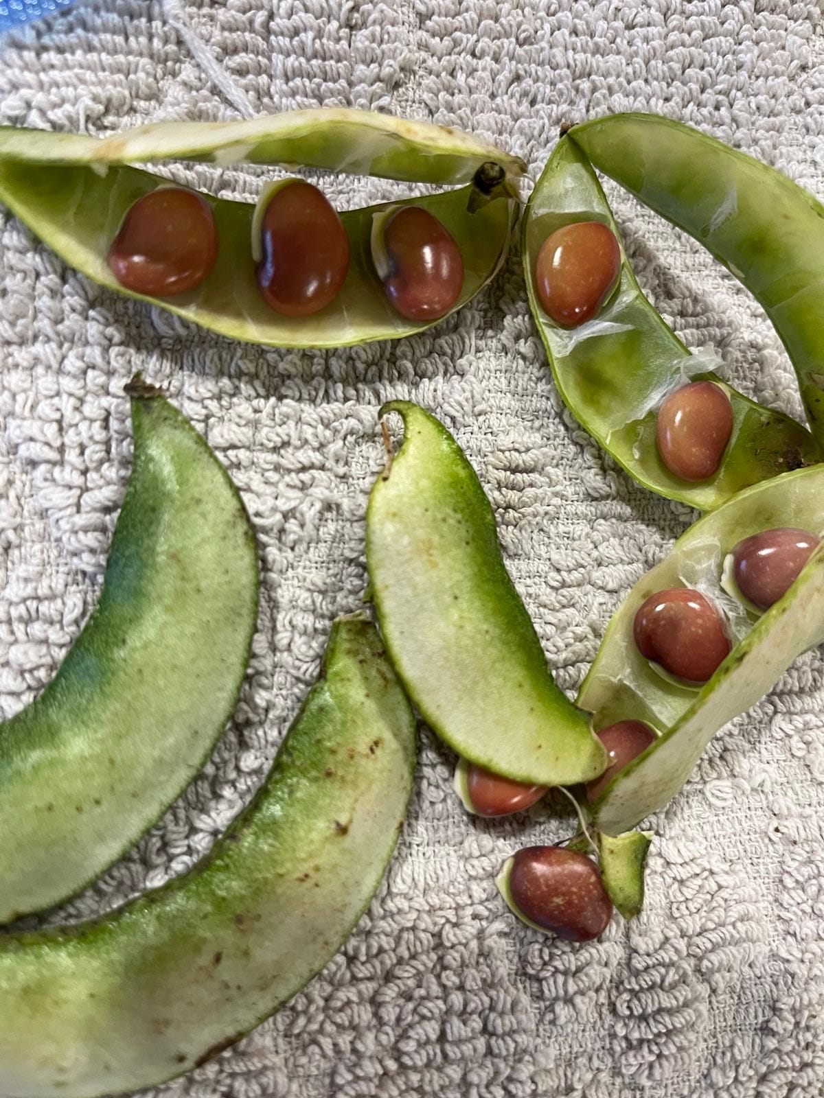 There are several varieties of hyacinth beans, also called lablab beans and the seed pod comes in several colors - light green, dark green, and purple. In the US the purple colored bean is more popular and grown as an ornamental. What a waste of perfectly good produce!