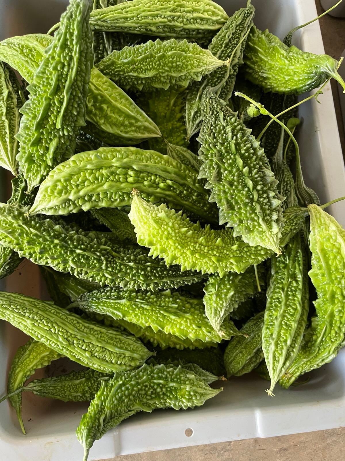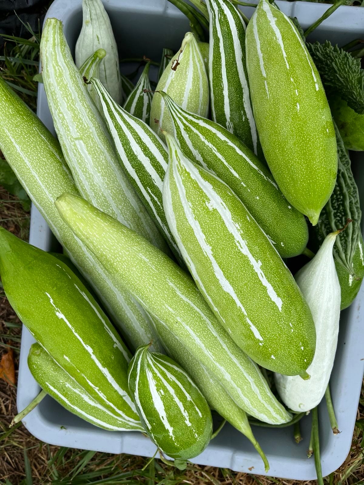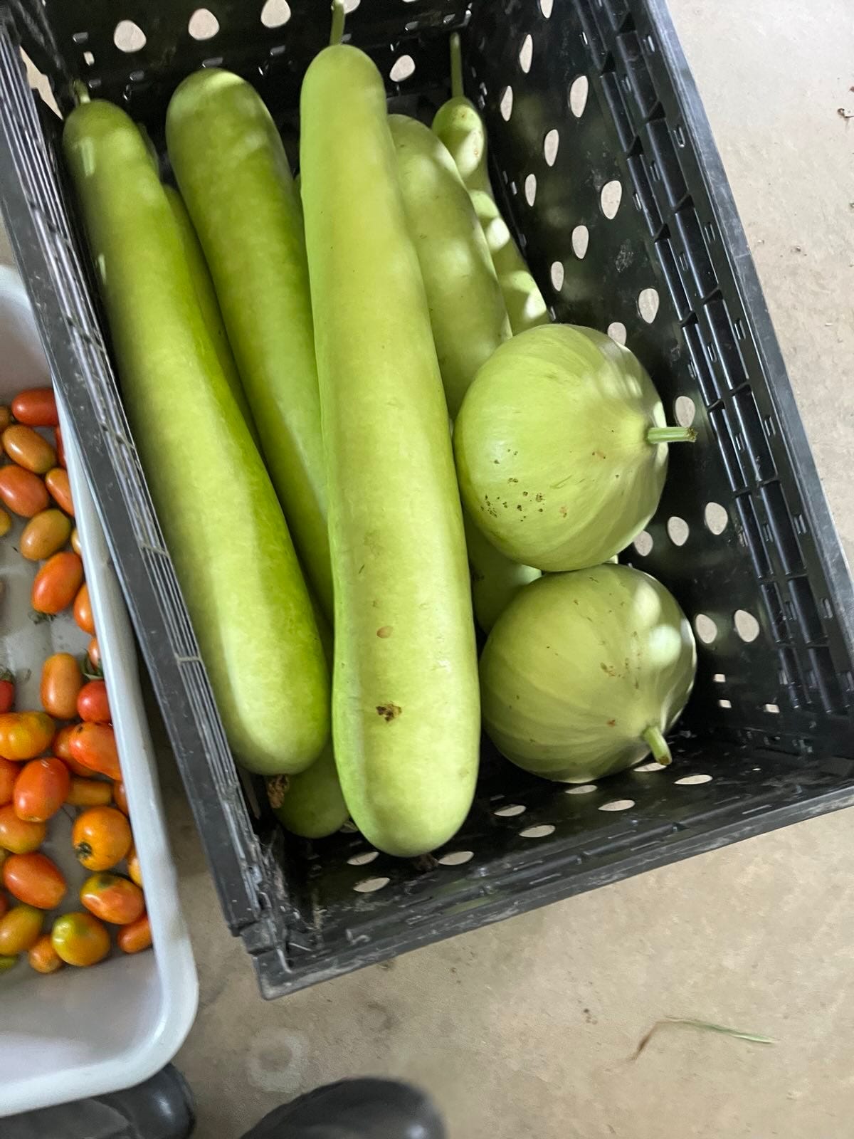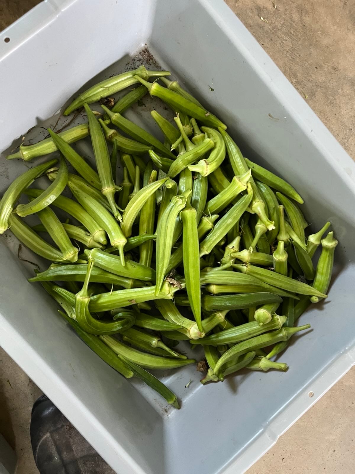 We are also harvesting Okra, snake gourd, bitter gourd, bell pepper, green chilies, green beans, hyacinth beans, bell pepper, sweet long pepper, eggplant, and ridge gourd.