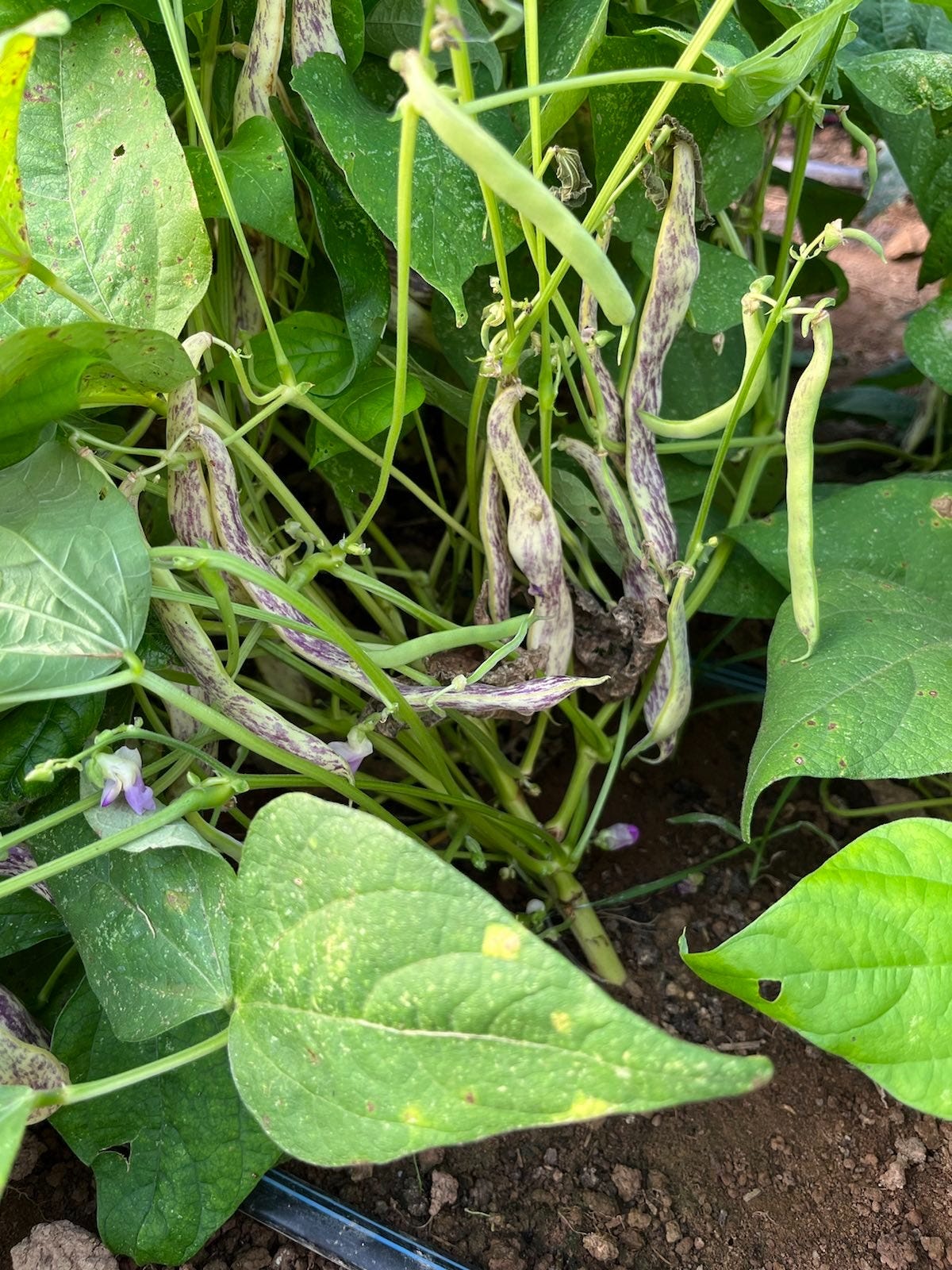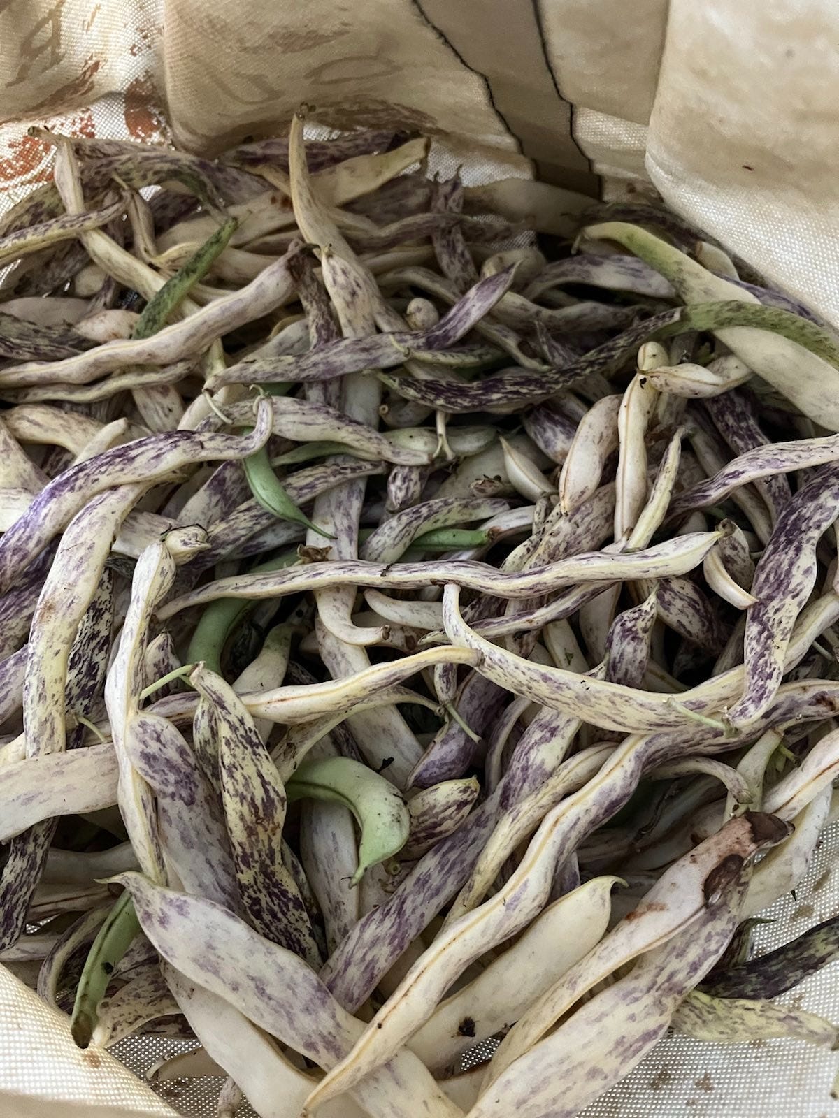 When I was looking for green bean seeds, I bought dragon tongue seeds because of the name not realizing that they are not going to look like green beans but this vibrant purplish white, green and sometimes orange in color.